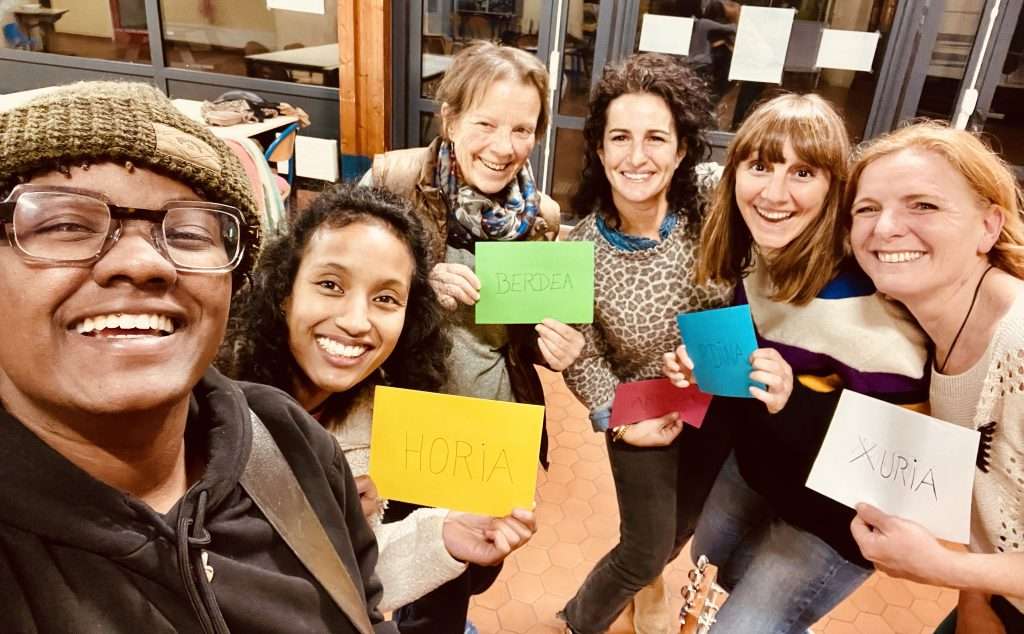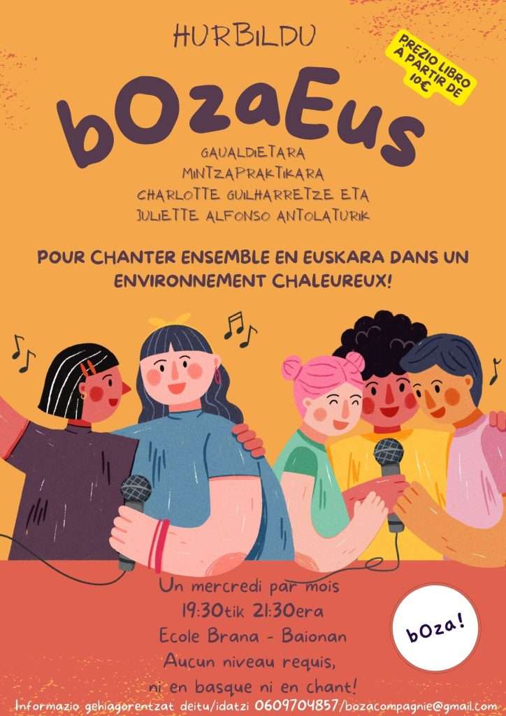 bOza Eus s’adresse à toutes et tous, locuteur·rice natif·ve ou apprenant·e du basque. Il ne s’agit pas d’un cours traditionnel, mais d’un moment de partage, de découverte et d’immersion dans la langue basque, par le biais du chant et de l’improvisation.