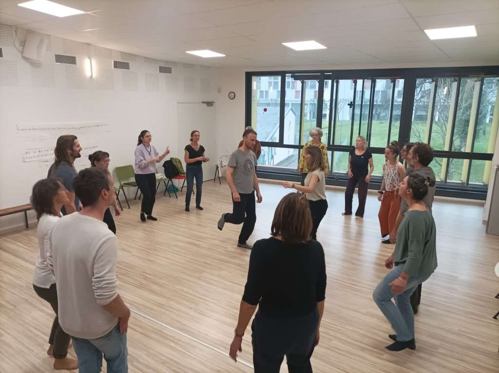 Chaque atelier est conçu pour mêler plaisir, créativité et apprentissage technique. On commence généralement par des échauffements vocaux et corporels, incluant du mouvement libre et de la corporalité, pour préparer la voix et le corps, essentiels pour chanter en toute liberté et éviter les tensions. Ensuite, des jeux vocaux et d’écoute permettent de stimuler l’imagination, la réactivité et la connexion avec le groupe. Le travail en groupe occupe une grande place, avec des exercices d’improvisation collective, d’arrangement vocal et de construction progressive des pièces musicales. Des éléments techniques sont intégrés en douceur, comme la respiration, la justesse, le placement de la voix ou les nuances, pour te donner des outils concrets à réinvestir dans ta pratique. Enfin, certains ateliers proposent aussi l’apprentissage de chants spécifiques, qu’ils soient traditionnels, contemporains, ou issus du répertoire inventé, afin d’enrichir ton répertoire vocal et ta capacité d’adaptation.
